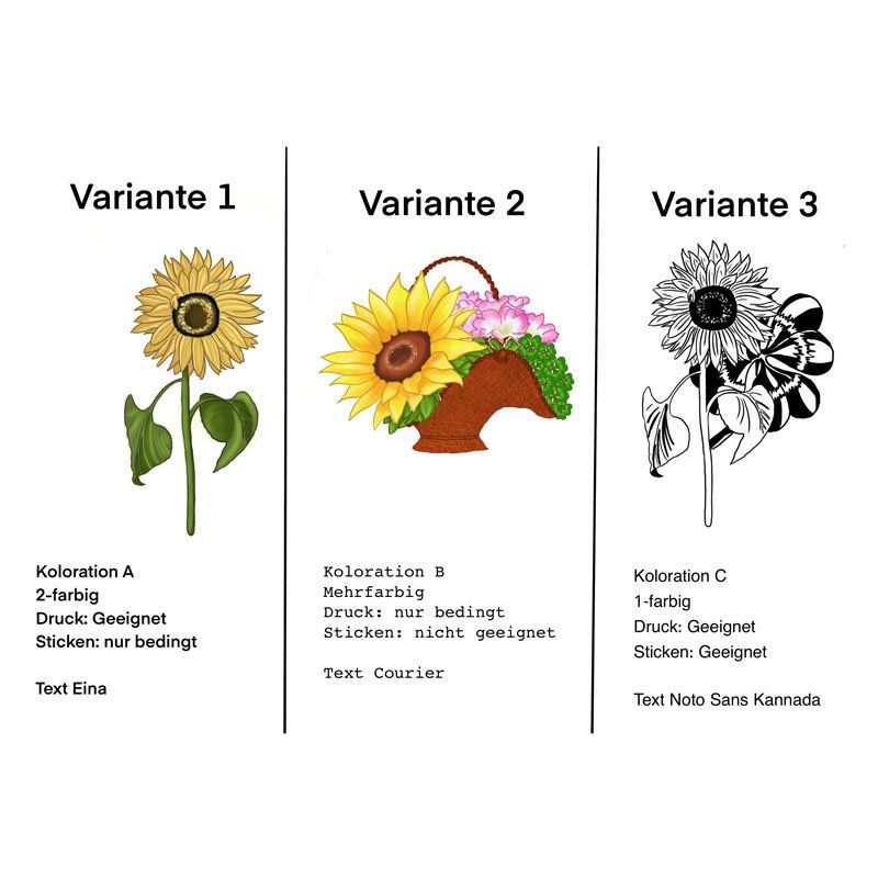 Es gibt drei Entwurfsrunden mit verschiedenen Varianten. Jedes Logo wird als Vektorisierung und in den Dateien SVG, EPS, PDF, PNG (gross und klein) geliefert.